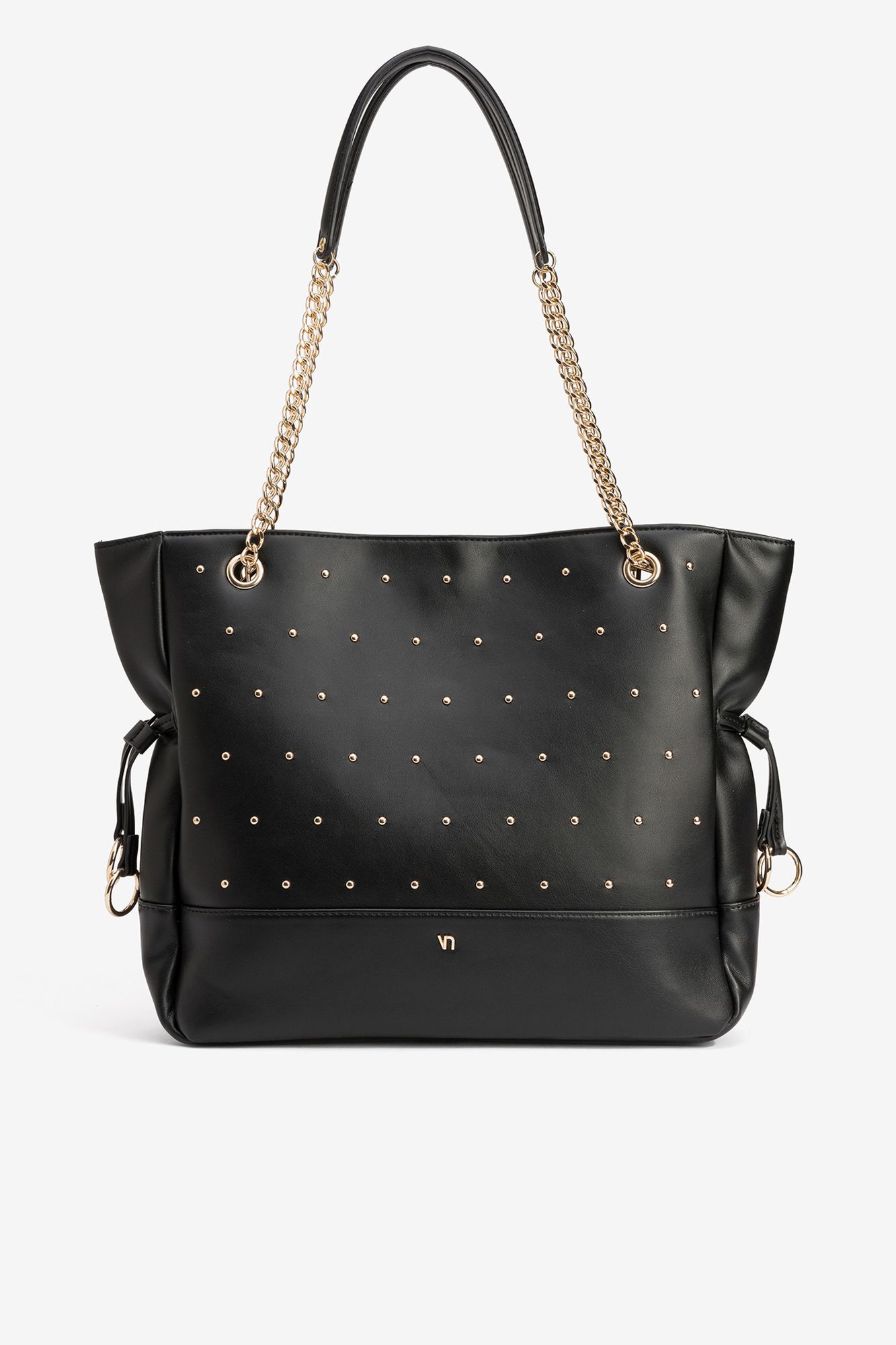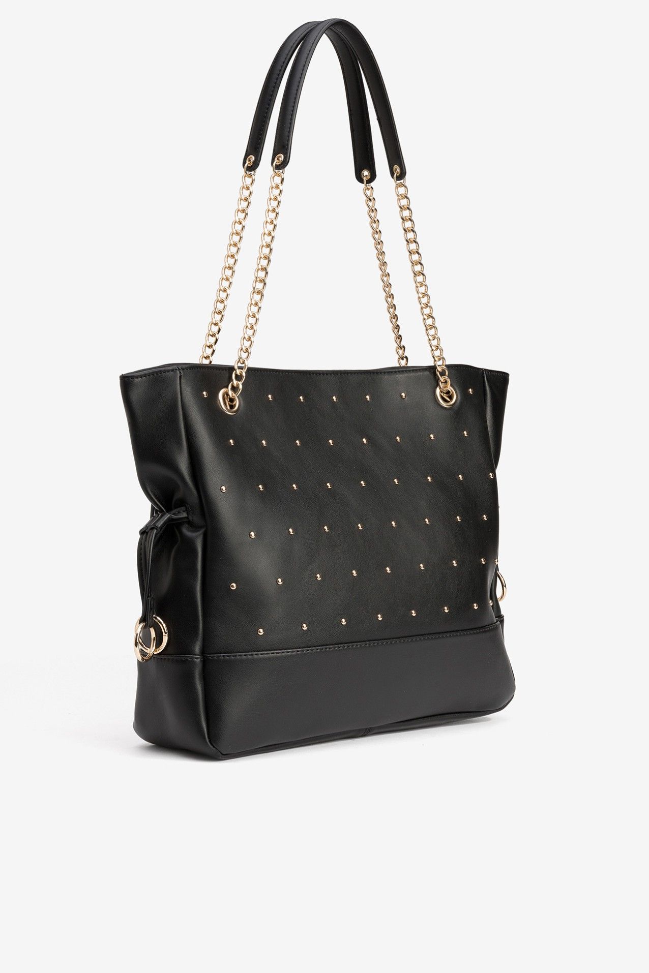 Bolso negro elegante con un toque rock-chic. ¡Las tachuelas doradas y las asas de cadena lo hacen irresistible!