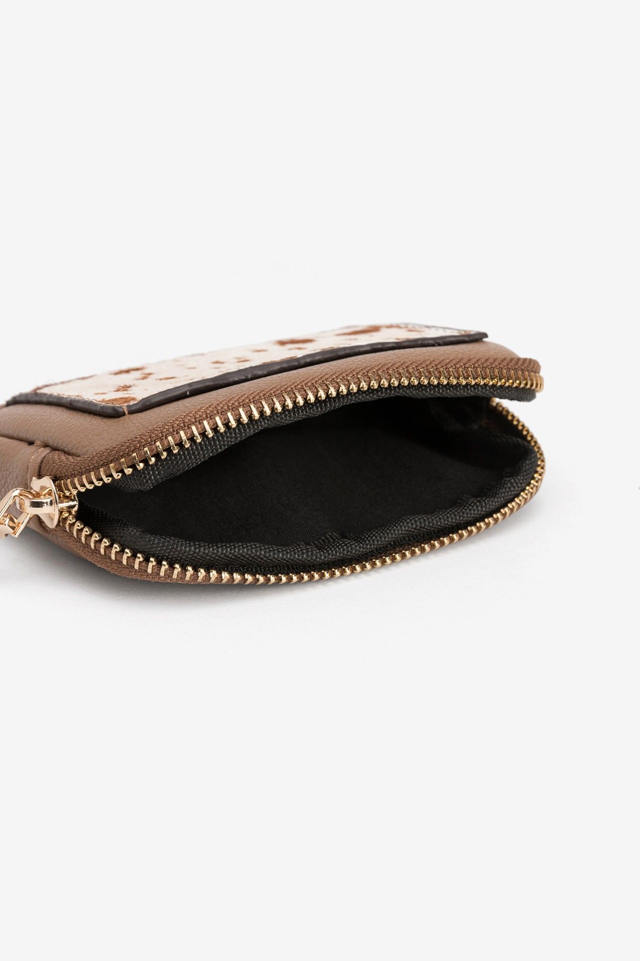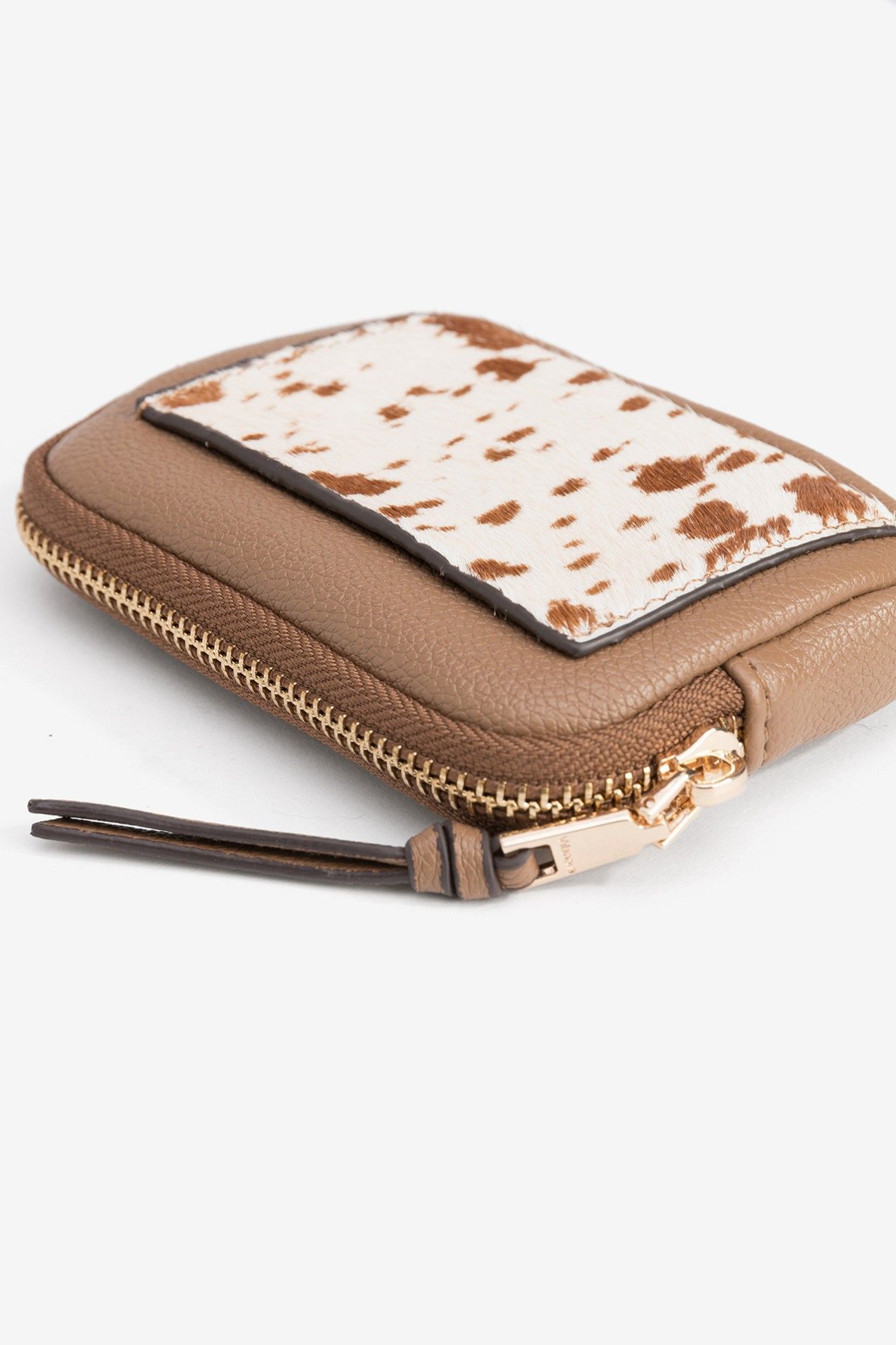Este monedero marrón con estampado animal combina la calidad de los materiales con un diseño de tendencia. Es pequeño y práctico, con un seguro cierre de cremallera dorada