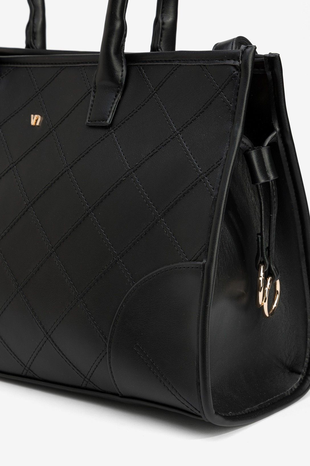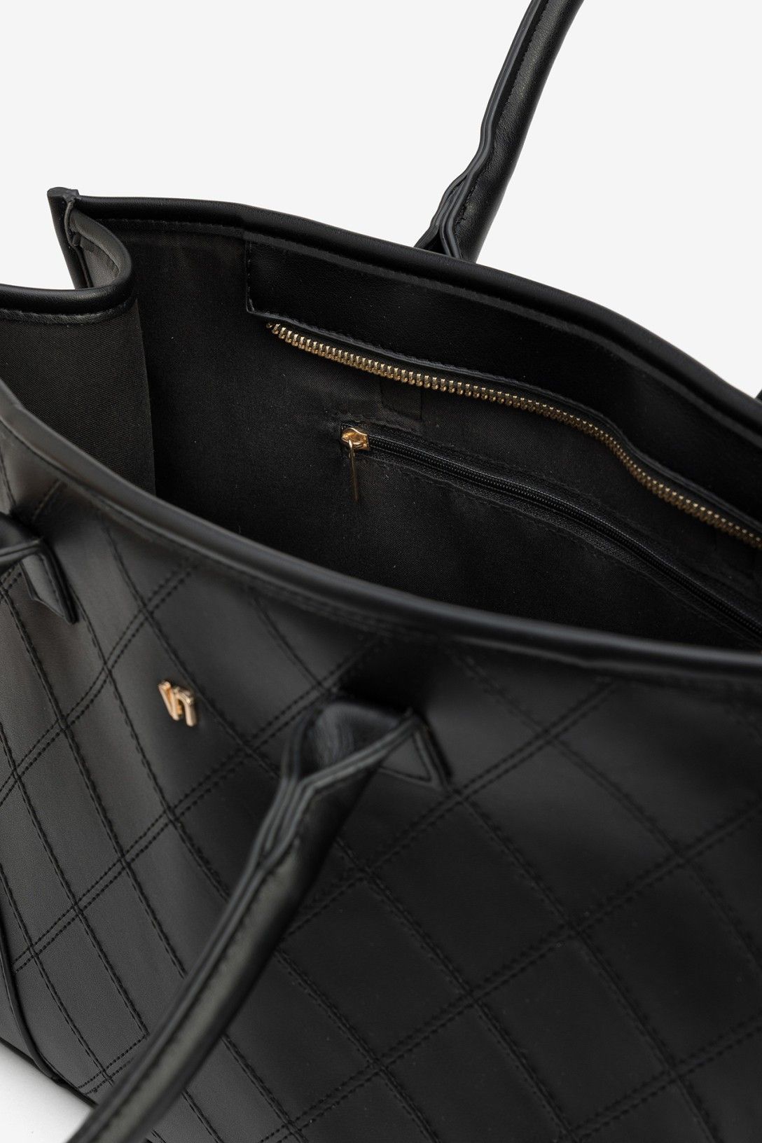 Bolso negro con diseño acolchado, asas dobles y detalles metálicos dorados. ¡El must-have moderno que aporta textura y lujo a tu look!