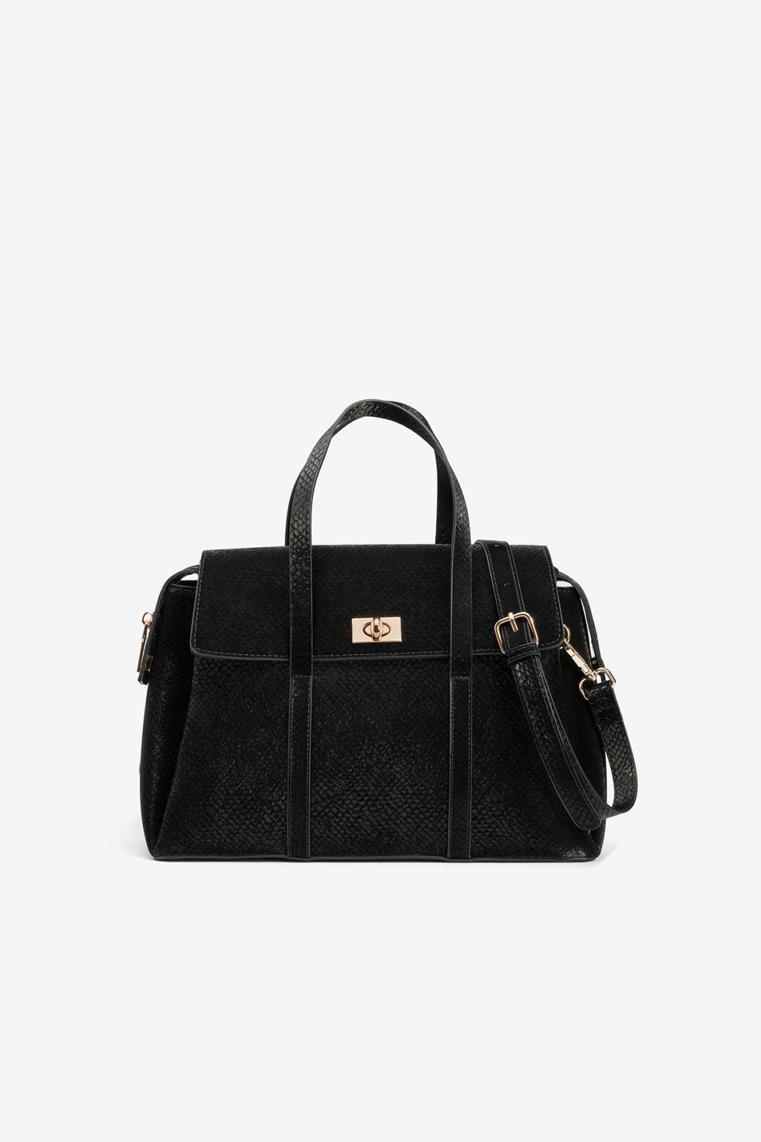 Bolso negro con textura, asas cortas y detalles dorados. ¡Un diseño versátil que te permite llevarlo de mano o al hombro!