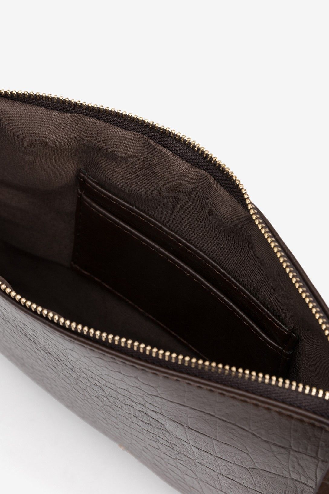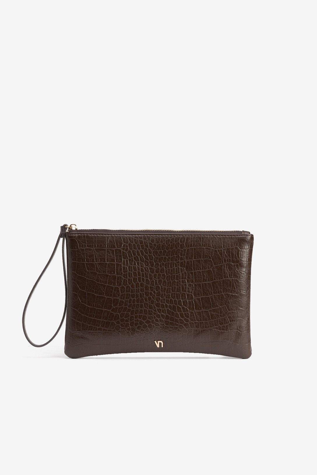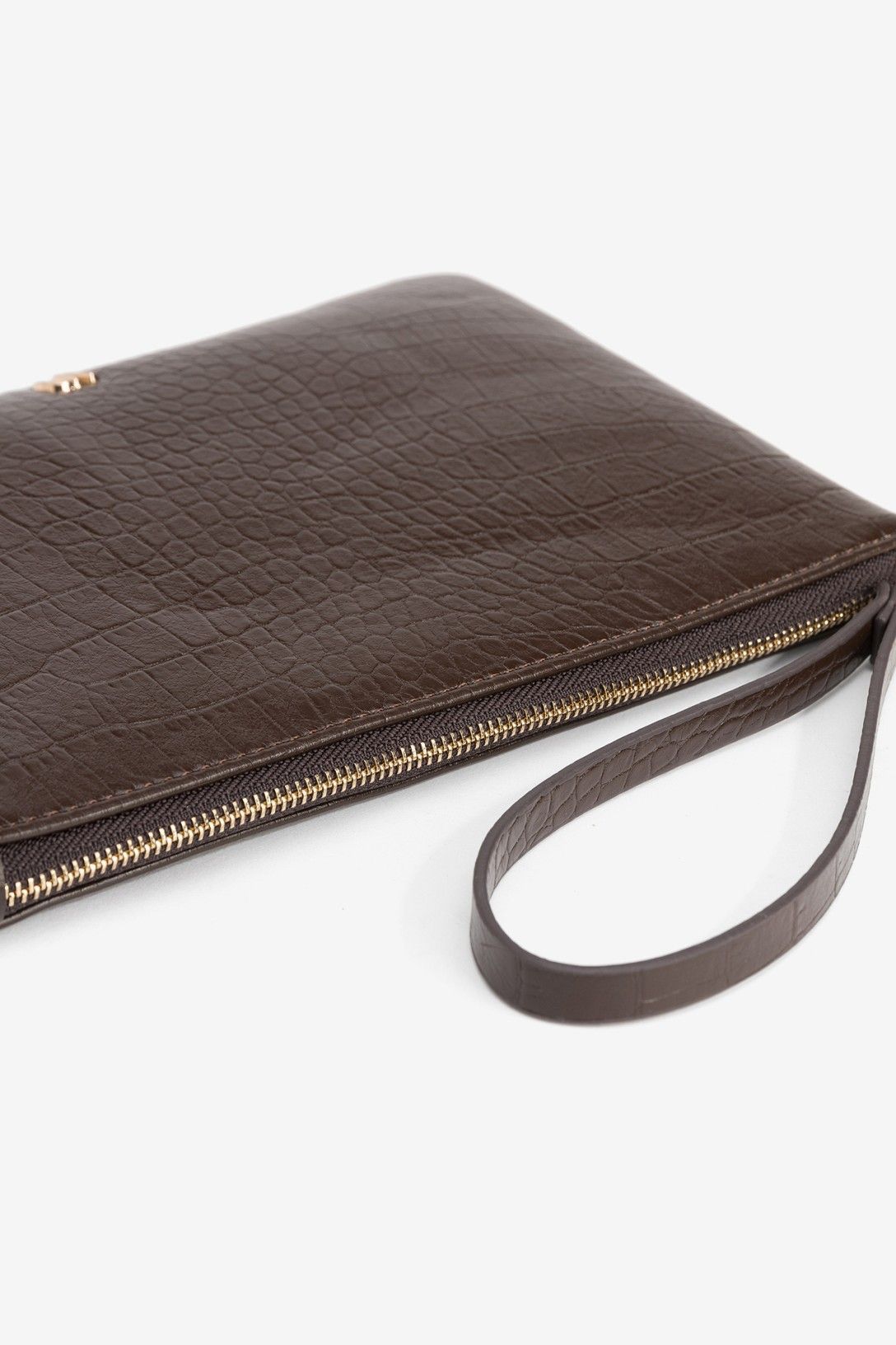 Este Bolso de Mano Multiusos Vilanova es ideal para llevar lo esencial con estilo o usarlo como un portamonedas grande y sofisticado. Su diseño en color marrón presenta una atractiva textura de cocodrilo que le da un toque de lujo. Incluye una correa de muñeca para mayor seguridad y comodidad, y un práctico cierre de cremallera.