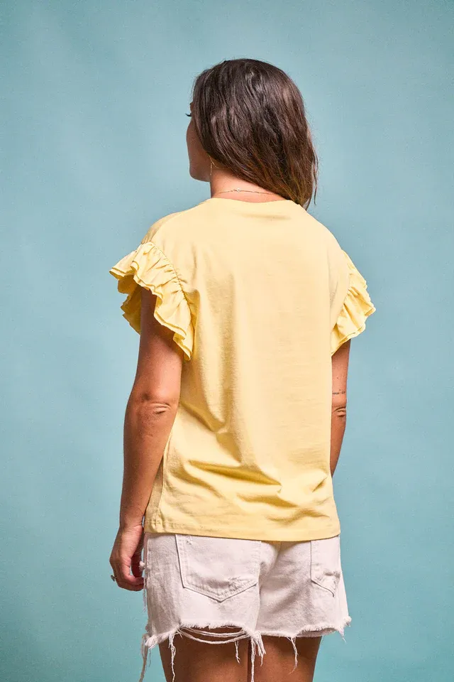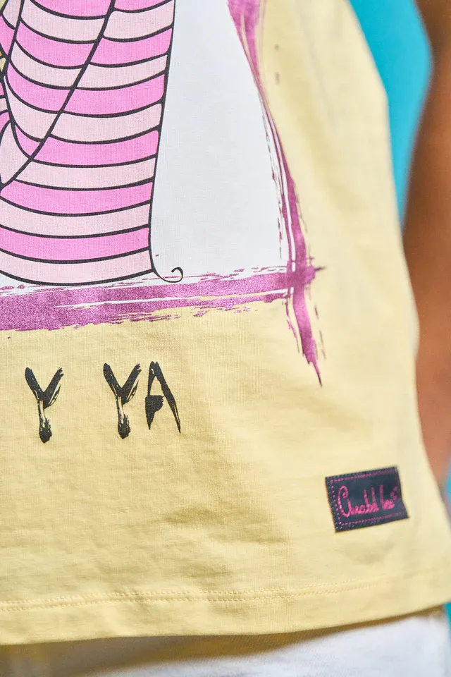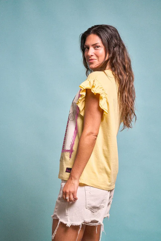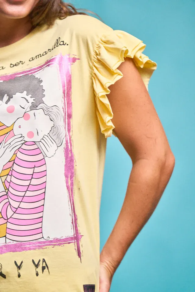EnComplementos Rocío Vera, mi Camiseta Anabel Lee "Amar" es de corte recto con manga corta y cuello redondo. Destaca por su doble volante en mangas y maxi print "AMAR Y YA" con foil rosa. ¡Pura alegría y estilo!
