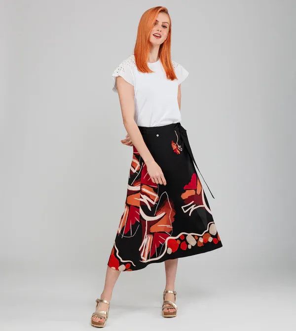 Falda de Anekke estampada Alma, esta falda de corte midi cruzada es de la colección Alma y cuenta con una estampación colorida en contraste con negro.